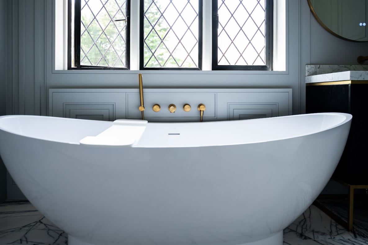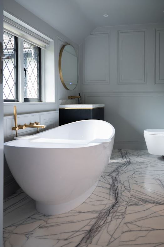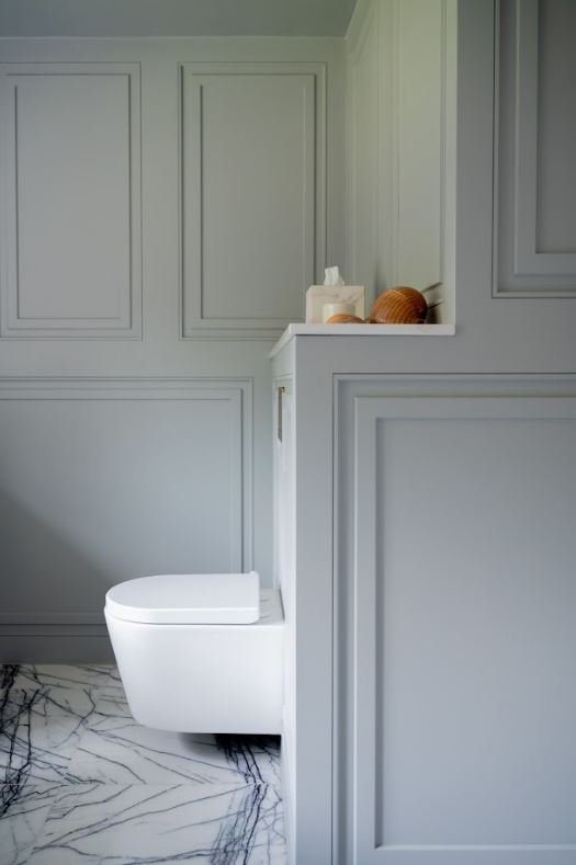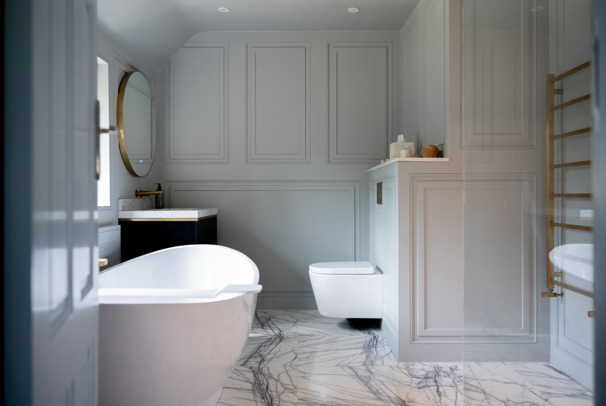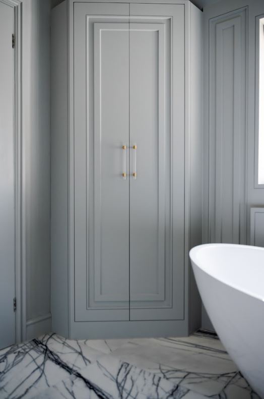 Every section of this wall panelling was carefully thought out to make this bathroom flow from the window surrounds to the bath tap panels. The elegance of the painted wood panelling and the bespoke wash laundry cupboard complements the beautiful marble tiling to give a fresh, clean and luxurious finish.