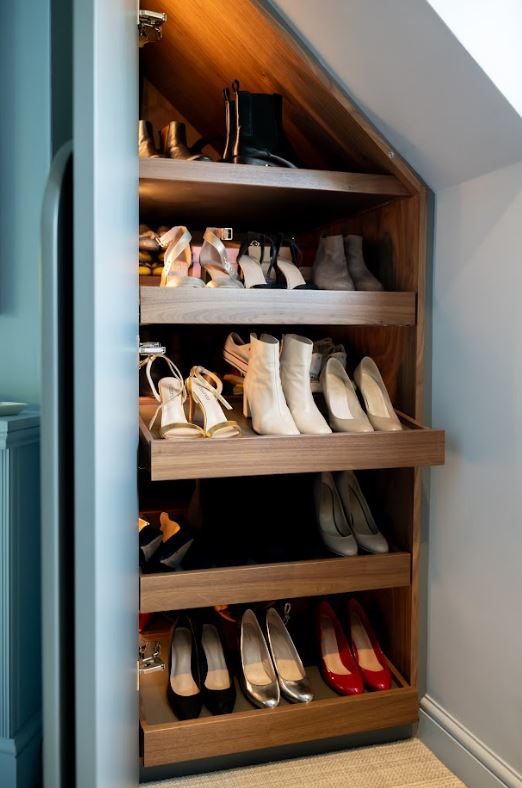 deep grey. We used warm LED lighting to light up the pullout walnut shoe drawers..