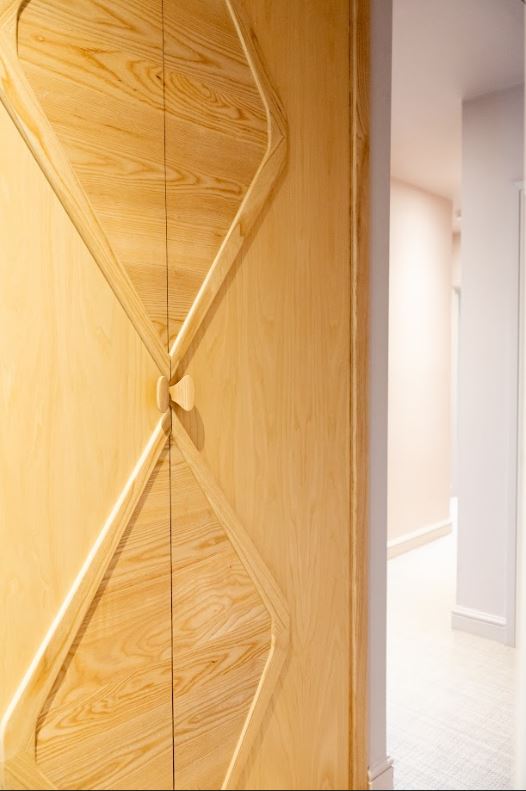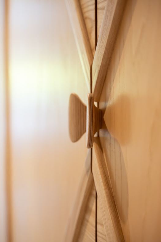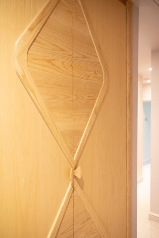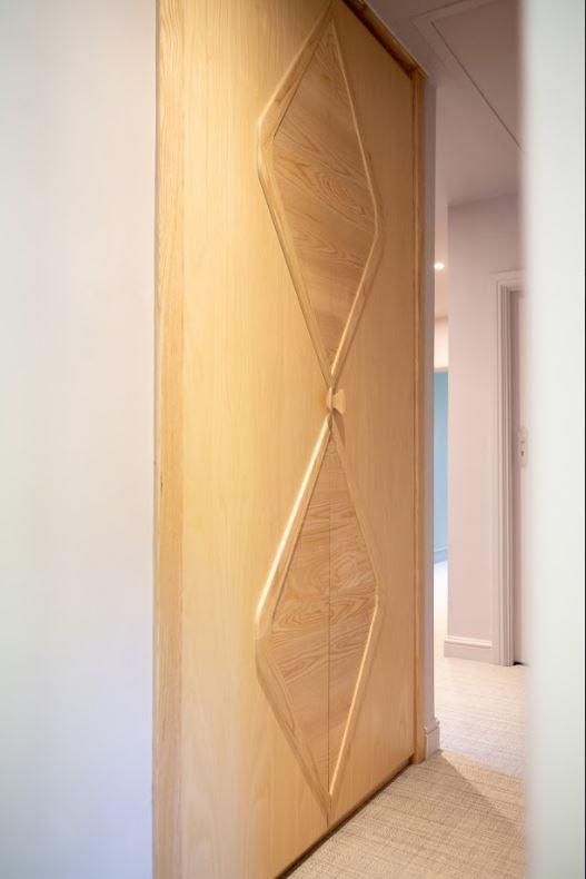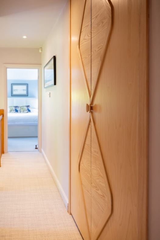 This elegant ash wood storage cupboard with diamond detail panelling and butterfly wing handles was a perfect addition to our clients bright and airy landing space.