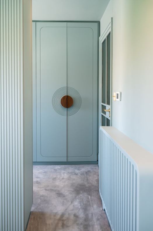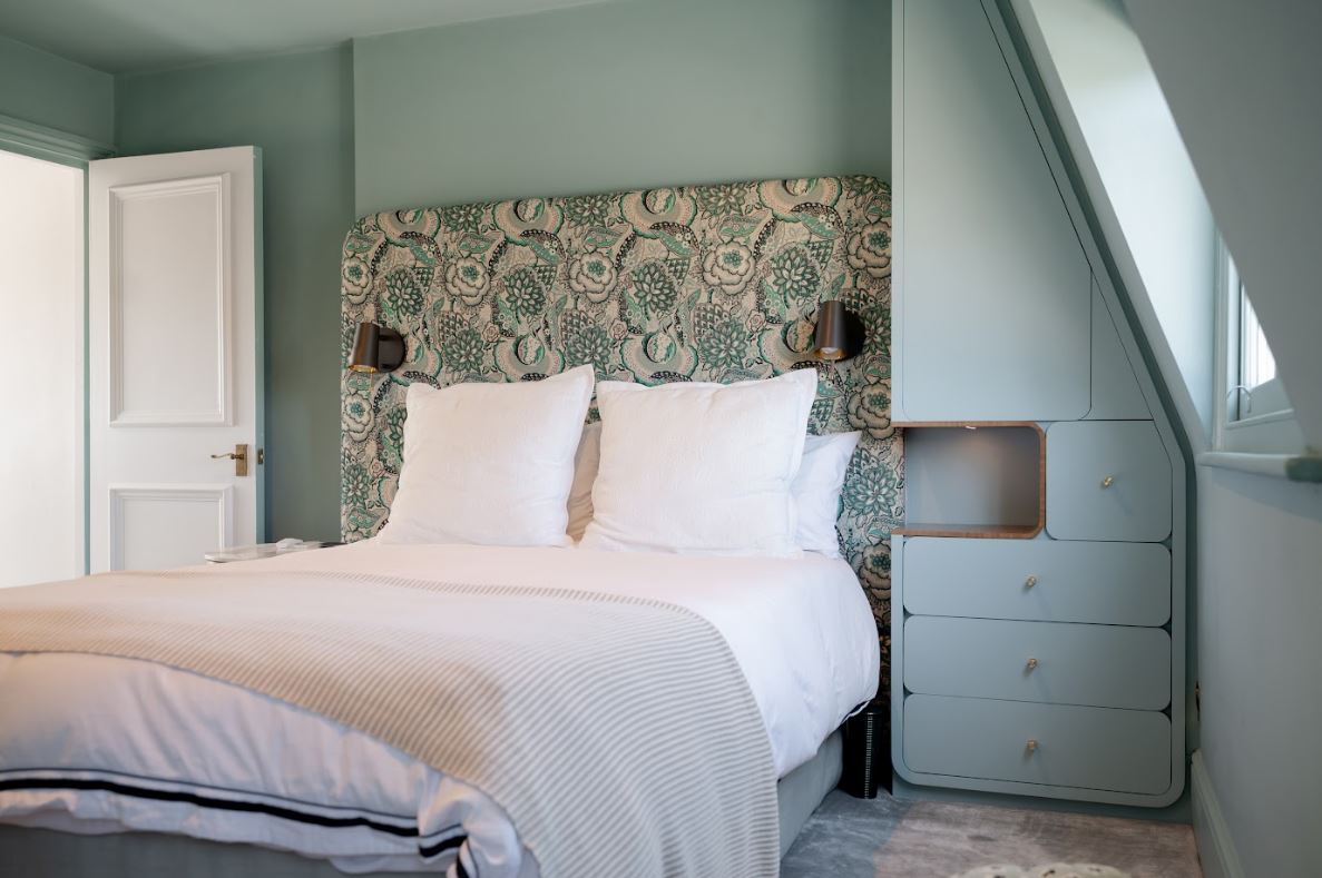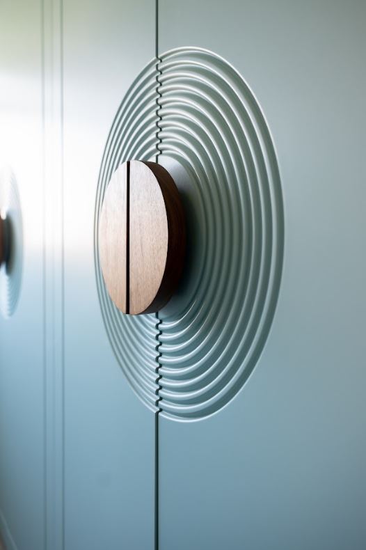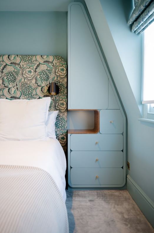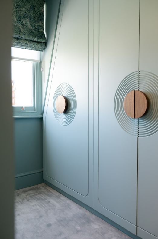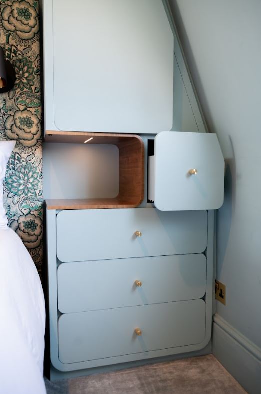 We wanted to create elegant yet functional furniture to fit the pitched ceilings in order to maximise the storage space for our clients. The circular feature on the wardrobe door handles brings a slightly retro twist to this modern design. Our clients wanted to create a divide in the room with an additional wardrobe that also serves well for a mounted TV to the back. The tall bedside table with open storage is perfect for those essentials at night.