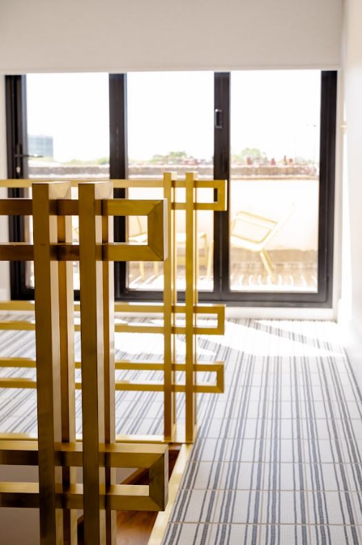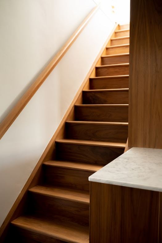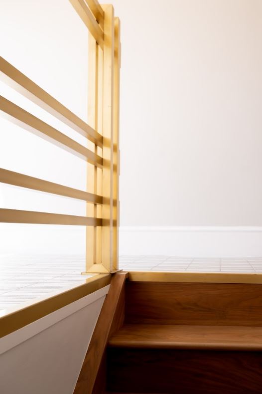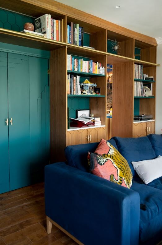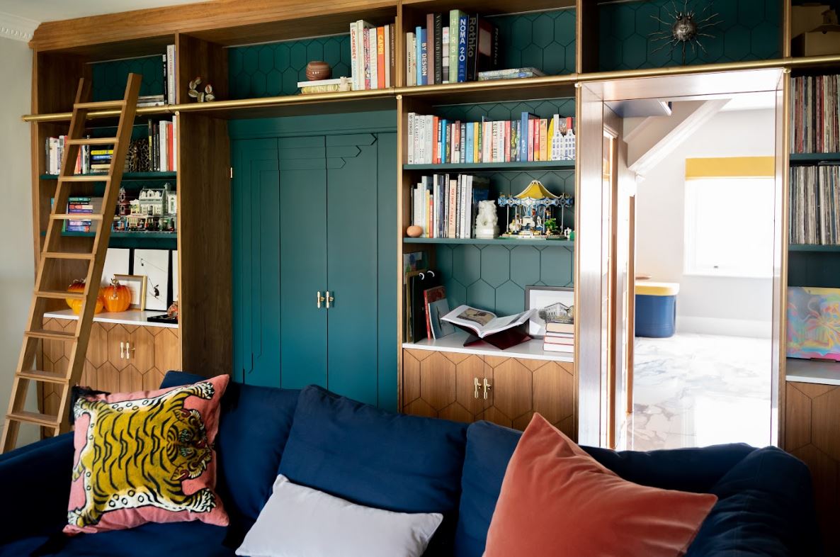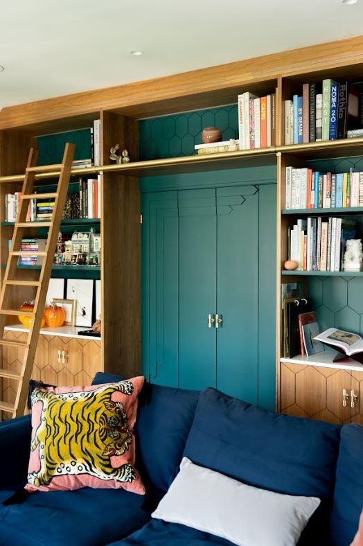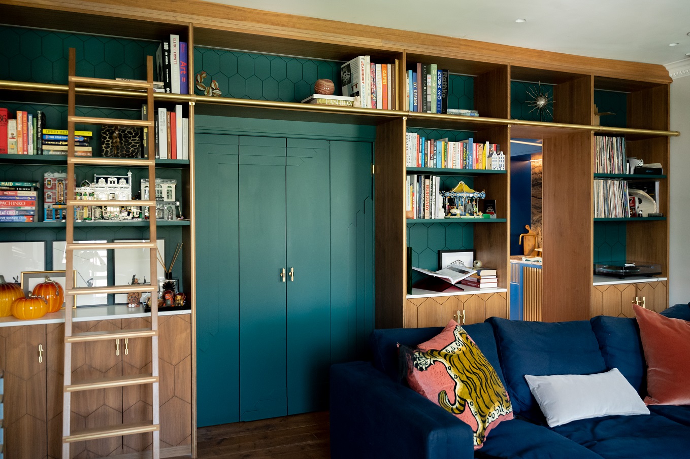 Display bookcases consisting of cupboards and open shelving with gold calcutta stone tops and a matching walnut ladder to reach the high sections. The hexagonal features on the cabinetry were all individually handmade. We spray painted the shelf backing and bifold doors in green Azur, and finished the piece with brass handles and ladder rail. The overall look is bold and contemporary to fit our clients’ tastes.