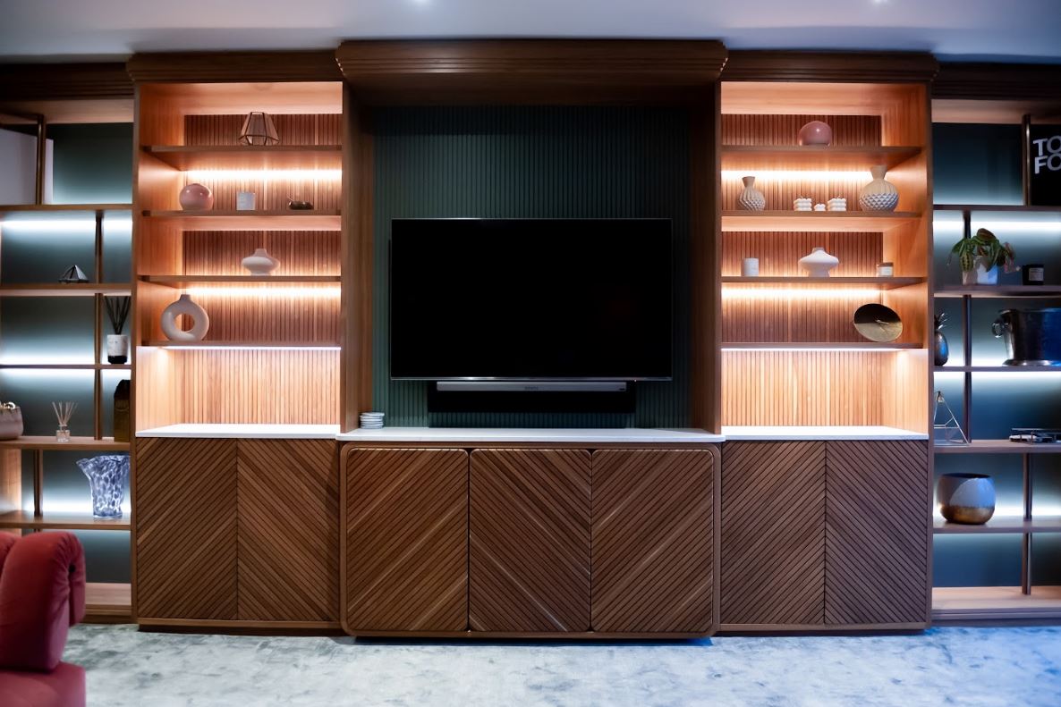 We created the cabinetry of this media unit in solid walnut wood with brass inlays and warm LED lighting, complete with walnut and brass supports for the open bookshelves.
