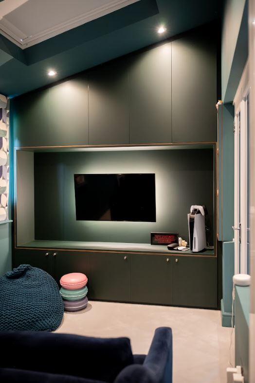 This playroom unit was made with game storage in mind. We mounted the TV with back LED lighting to enhance the matt green materials used. The top doors were fitted with push to open door catches.